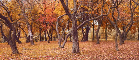 Beautiful autumn landscape. Bright orange and yellow colors. Sunny day in forest. Crooked tree trunks. Lots of fallen leaves on ground. Wide banner.