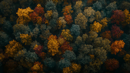 Capture an aerial perspective of a vibrant autumn forest, showcasing a diverse array of colorful trees and rich foliage in stunning natural harmony.