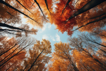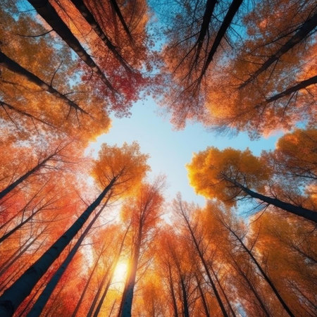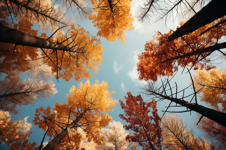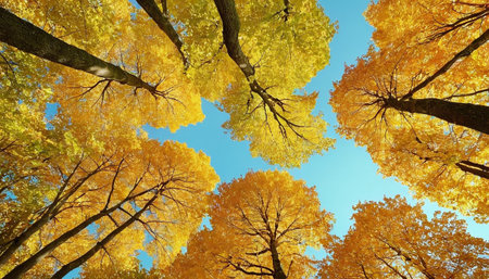 An immersive upward view into a forest during the autumn season, showcasing a display of yellow and orange foliage. The vibrant leaves create a warm, glowing canopy against a clear, expansive blue sky. The strong lines of the tree trunks and branches lead the eye upwards, emphasizing the height and density of the forest. captures the essence of fall, with its rich colors and the serene beauty of nature's transformation.