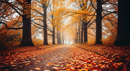 A path through a forest with orange leaves. Generative AI.
