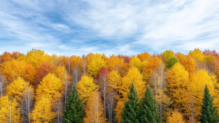 Serene Canadian forest in autumn with colorful trees and room for text in the sky