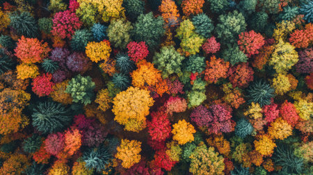 Aerial View of Vibrant Autumn Forest in Red, Orange, and Gold A stunning top-down perspective of a dense autumn forest
