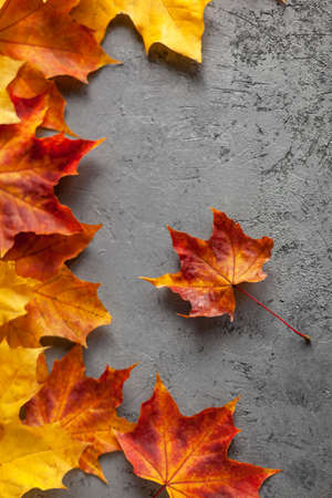 Pattern made of minimal composition of colorful marple fall leaves on gray concrete wall. closeup Frame Autumn concept. Flat lay copy space for text.