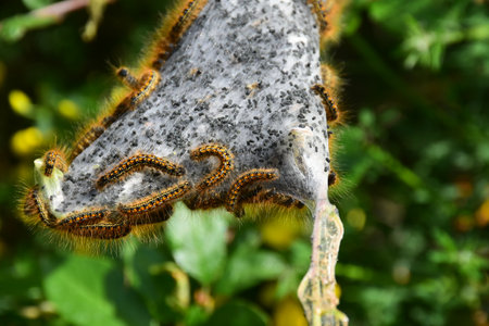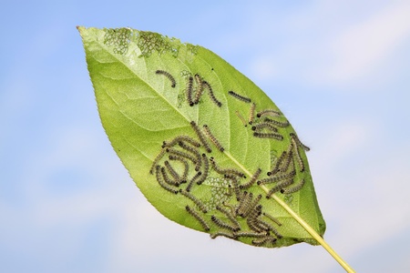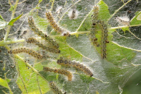 Caterpillars of the Aporia crataegi (black-veined white) eating apple leaves, close up macro detail, soft blurry bokeh
