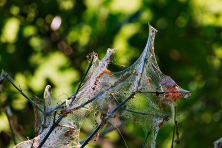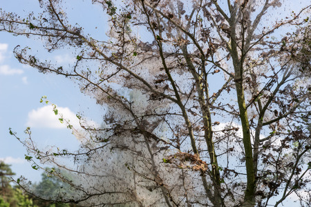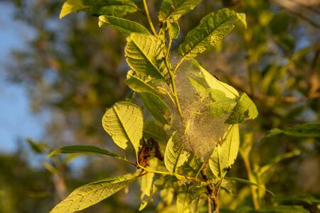 Nesting web of ermine moth caterpillars, yponomeutidae, hanging from the branches of a tree