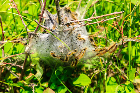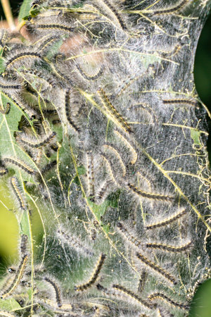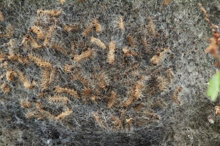 Closeup of a pest larvae caterpillars of the Yponomeutidae family or ermine moths, formed communal webs around a tree.