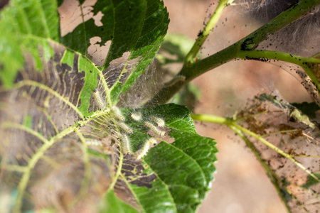 Affected fruit plant leaves covered in webbing and caterpillars, including the larvae of the American butterfly. Control of garden insect pests.
