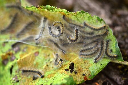 The Group Of Caterpillars On Green Tree Leaf. Caterpillar Babies Colony On Green Leaves. Poisonous hairs are dangerous for human skin and lungs rash.