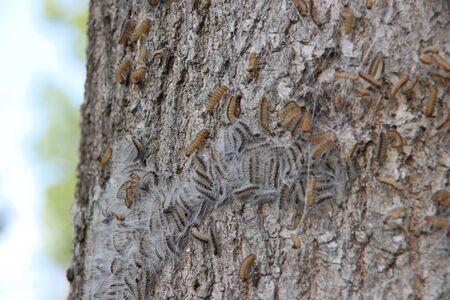 Closeup on an aggregation of hairy, colorful caterpillars of the Gypsy moth, Lymantria dispar, on a tree trunk