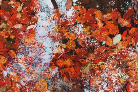 Autumn orange leaves on the ground near a stream in the forest, filled with autumn red and yellow foliage. As a background, abstract