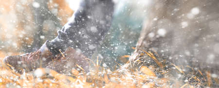 Colorful autumn leaves with first winter snow in the forest. Concept of winter coming and autumn leaving.