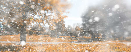 Beautiful winter landscape with snow covered trees and falling leaves. First snow