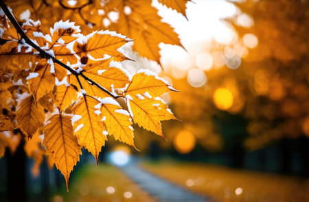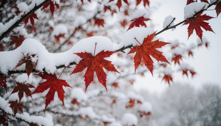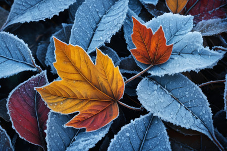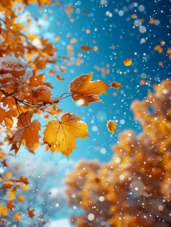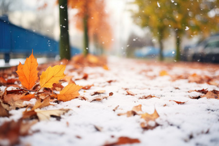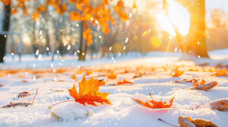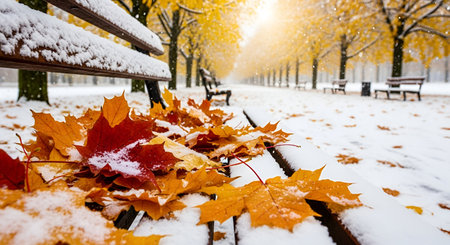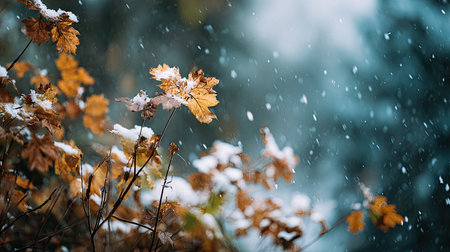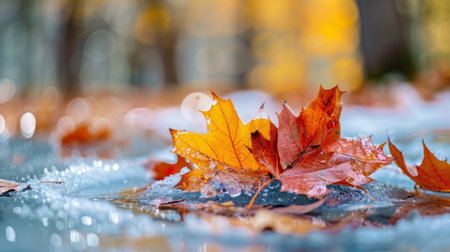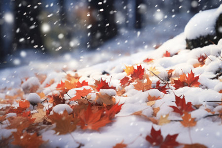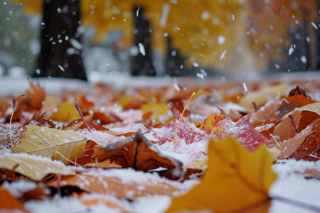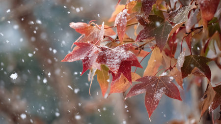 Vibrant autumn leaves dusted with the seasons first snow, depicting a seasonal transition