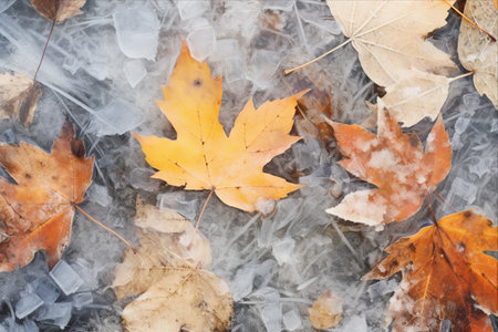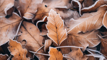 Generative AI : Frozen autumn leaves seasonal vintage winter background macro image