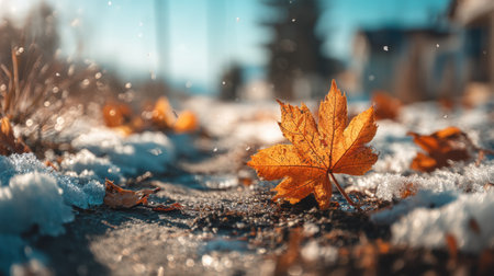 Vibrant orange leaf rests on snowy path, surrounded by fallen leaves and glistening snowflakes. scene captures beauty of autumn transitioning into winter, evoking sense of tranquility and change
