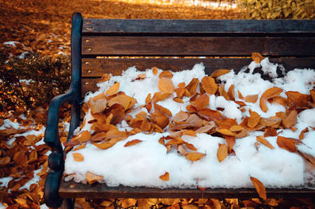 Old wooden bench covered by fallen leaves and first snow at the end of autumn