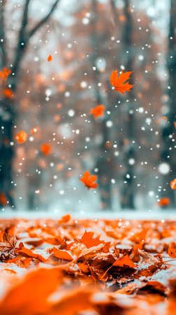 A beautiful forest showcases vivid orange and yellow leaves on trees amidst gentle snowfall. The serene atmosphere highlights the transition of seasons, blending autumn hues with winter's first snow.