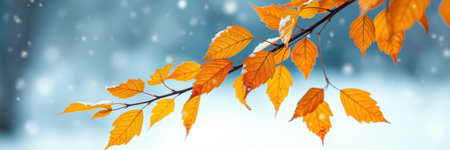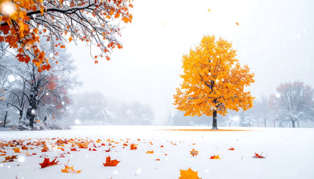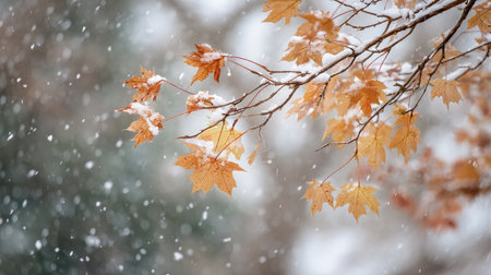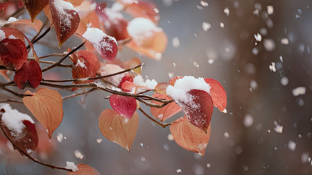 Vibrant autumn leaves gently sway on branches as snow begins to fall in a serene winter landscape