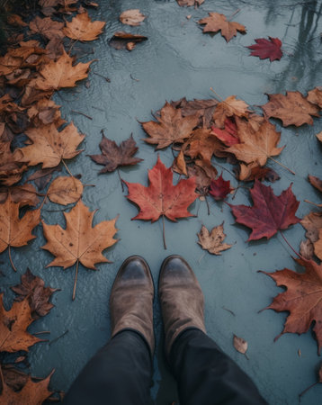 AI Generated. Autumn Leaves on Wet Ground with Boots in View