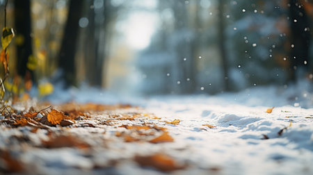 Snow and orange dry leaves forest. Social media background. Winter and autumn ad.