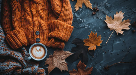 A knitted orange sweater and scarf lie on a dark blue surface with fallen autumn leaves, a cup of coffee, and a sprig of star anise.