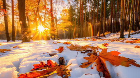 A breathtaking autumn sunrise illuminates a quiet forest, featuring vibrant leaves among fresh snow. The scene captures the serene beauty of nature, showcasing a tranquil moment at dawn.