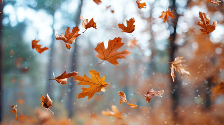 Dry oak and maple leaves caught mid-air as they dance in the wind, forest background slightly blurred