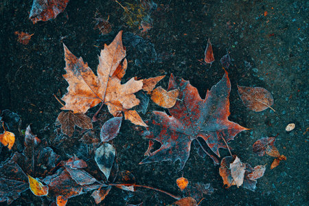 Frost covered closeup autumn leaves beautiful background. Cold weather frozen winter seasonal scene. Top view fall foliage wallpaper.