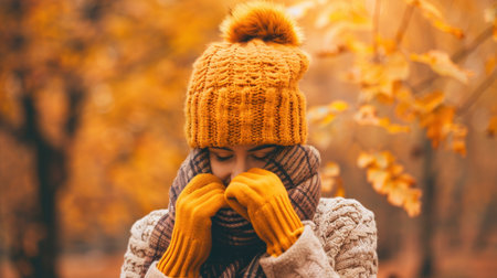 A woman wearing a yellow knitted hat, gloves, and a plaid scarf stands in an autumn forest. The leaves are changing colors and the air is crisp. She is bundled up to stay warm in the cooler weather.