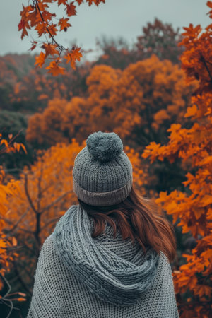 Woman in cozy knitwear immersed in the vibrant beauty of fall foliage in a colorful forest.