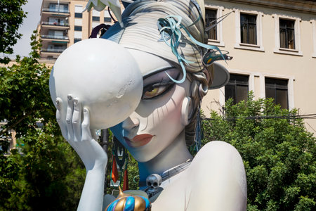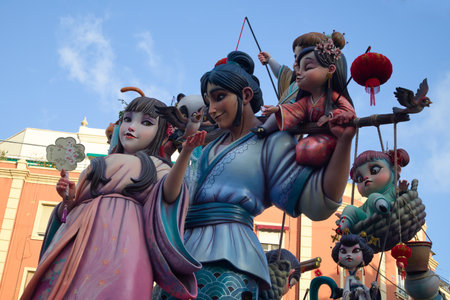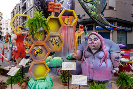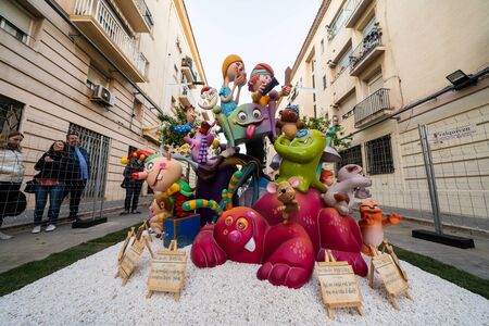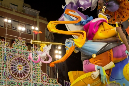 Valencia, Spain - March 16, 2019: Detail of some Fallas day monuments, publicly displayed in the squares of the neighborhoods to be admired by tourists.