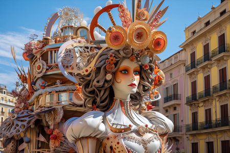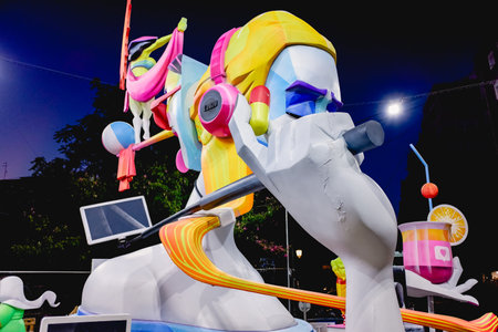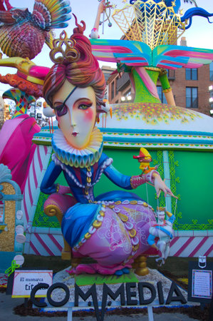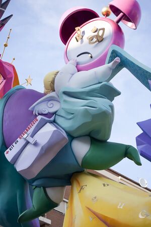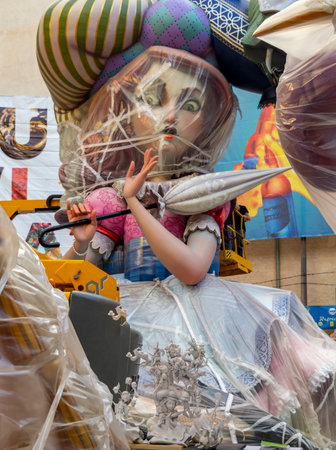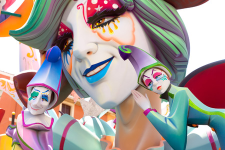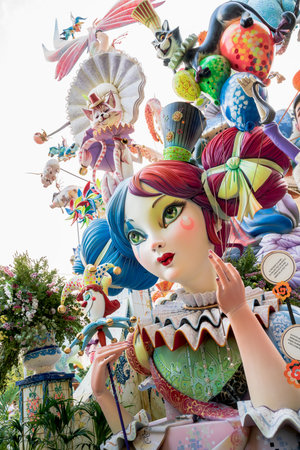 Valencia, Spain - March 19, 2019: Detail of the beautiful and traditional Fallas, colorful monuments manufactured to be burned in the night of San Jose.