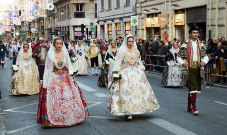 Valencia, Spain, March 18, 2019. Valencian Festival of Fallas. Festive procession in the center of the city. Women Falleras of Valencia.