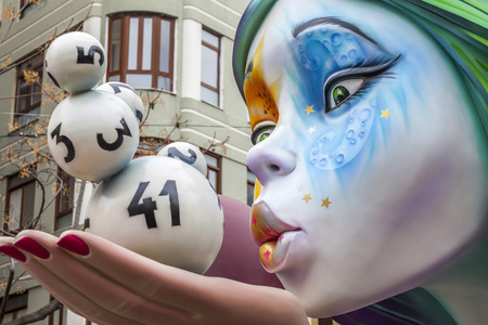 Valencia, Spain - 4 September 2021: Large paper mache display of girl holding baloons with the topic 'extravagance' for the national festival Fallas, which made the 3rd place in the years competition