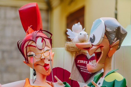 VALENCIA, SPAIN- MARCH 19, 2018: Two lovers kissing falla, the Fallas is a typical celebration where monuments are built for being burnt in Valencia, Spain