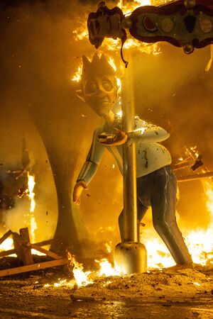 Valencia, Spain - March 19, 2019: Detail of a Falla Valenciana burning between flames of fire.