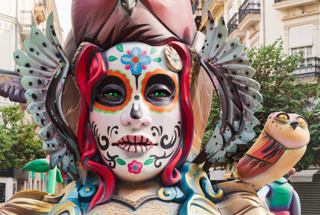 Valencia, Spain - September 4, 2021: Detail of a paper mache sculpture with 'day of the dead' catrina face and owl for the national festival Fallas