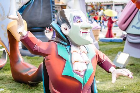 VALENCIA, SPAIN - MARCH 18, 2019: Grotesque colorful doll statues (ninot) imaging famous people, cartoon and mythic characters on traditional spring festival Fallas