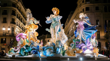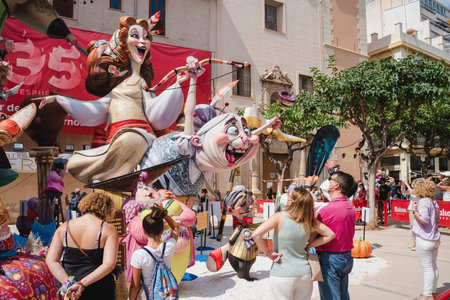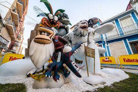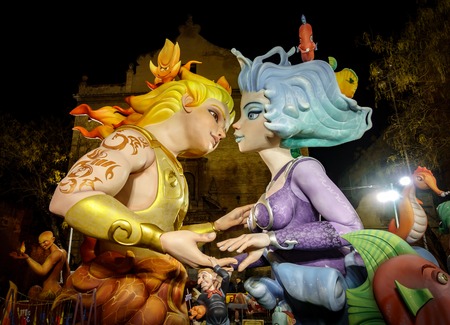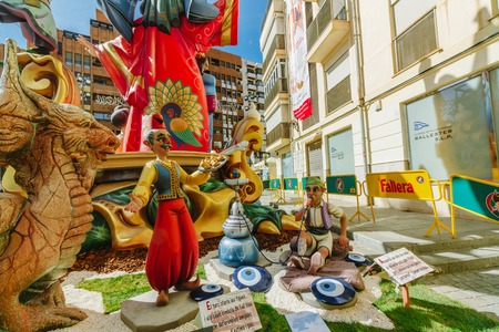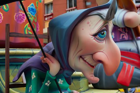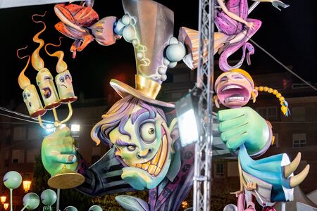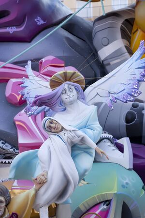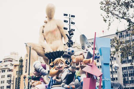 Valencia, Spain - March 16, 2019: Detail of some Fallas day monuments, publicly displayed in the squares of the neighborhoods to be admired by tourists.
