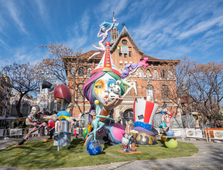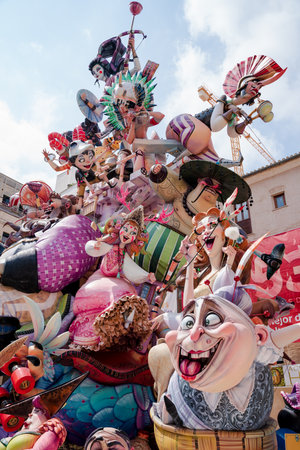 Valencia, Spain - March 16, 2019: Fallas stone cartons of a Falla profusely painted with striking colors, during the Valencian fiestas exposed in the streets before being burned.