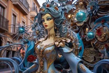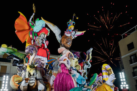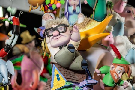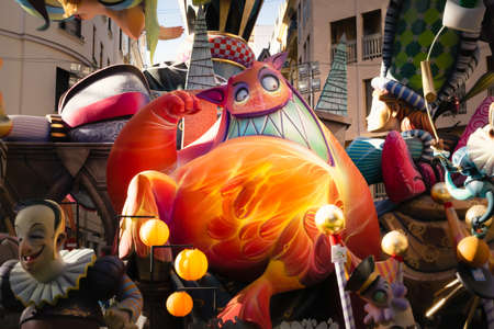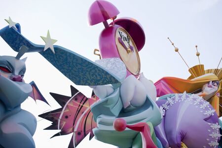 Valencia, Spain - March 19, 2019: Detail of the beautiful and traditional Fallas, colorful monuments manufactured to be burned in the night of San Jose.