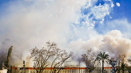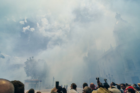 Valencia, Spain - March 7, 2019: Great smoke caused by the explosion of hundreds of firecrackers fired in the traditional mascletá at the parties of Fallas in the town hall square.