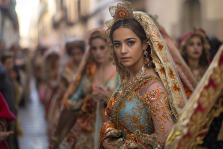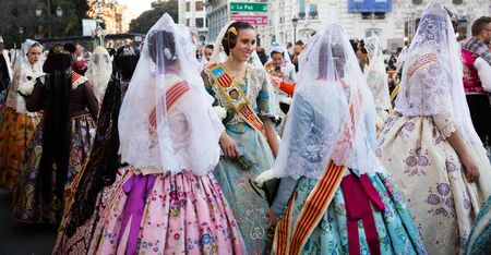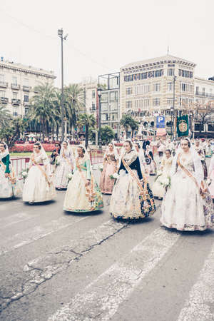 VALENCIA,SPAIN - MARCH 18: Several unidentified women walk in the offering of Fallas, one of the biggest parties in Spain on March 18,2016 in Valencia,Spain.