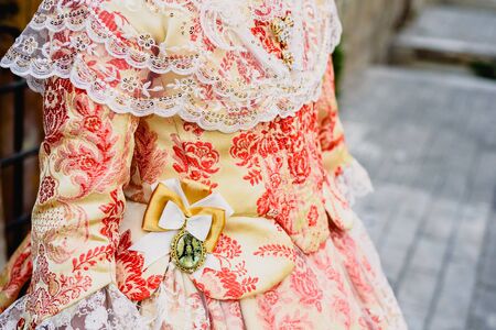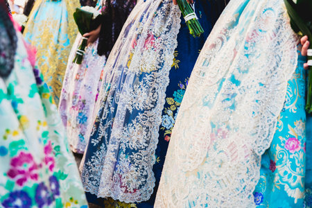 Valencia, Spain - March 17, 2019: Detail of the typical fallero dress, during the colorful and traditional parade of the offering, handmade embroidered dresses for the falleras.