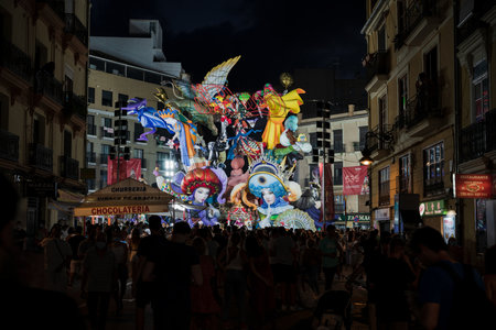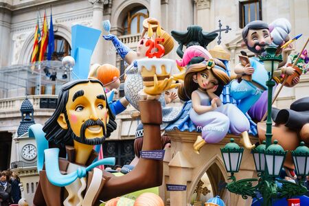 Falla in city centre during national Festival of Fallas. Valencia, Spain, March 16, 2018