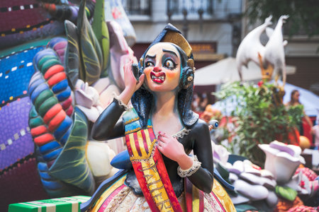 Valencia, Spain - March 18, 2019: Huge colorful dolls made of cardboard, paper-mache and polystyrene foam on streets of Valencia during annual Las Falles spring festival