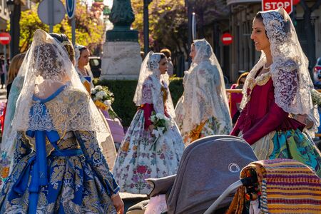 Valencia, Spain, March 18, 2019. Valencian Festival of Fallas. Festive procession in the center of the city. Women Falleras of Valencia.