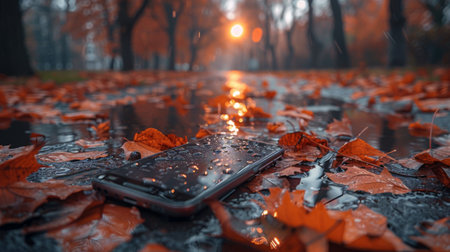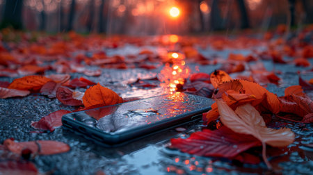 Smartphone on Wet Pavement with Fallen Autumn Leaves and Dramatic Sunset Reflection