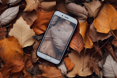 A top view of an image of leaves on a screen of a smartphone camouflaged on brown leaves on the ground