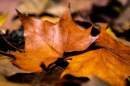 Closeup of leaves fallen on the floor in the autumnal forest